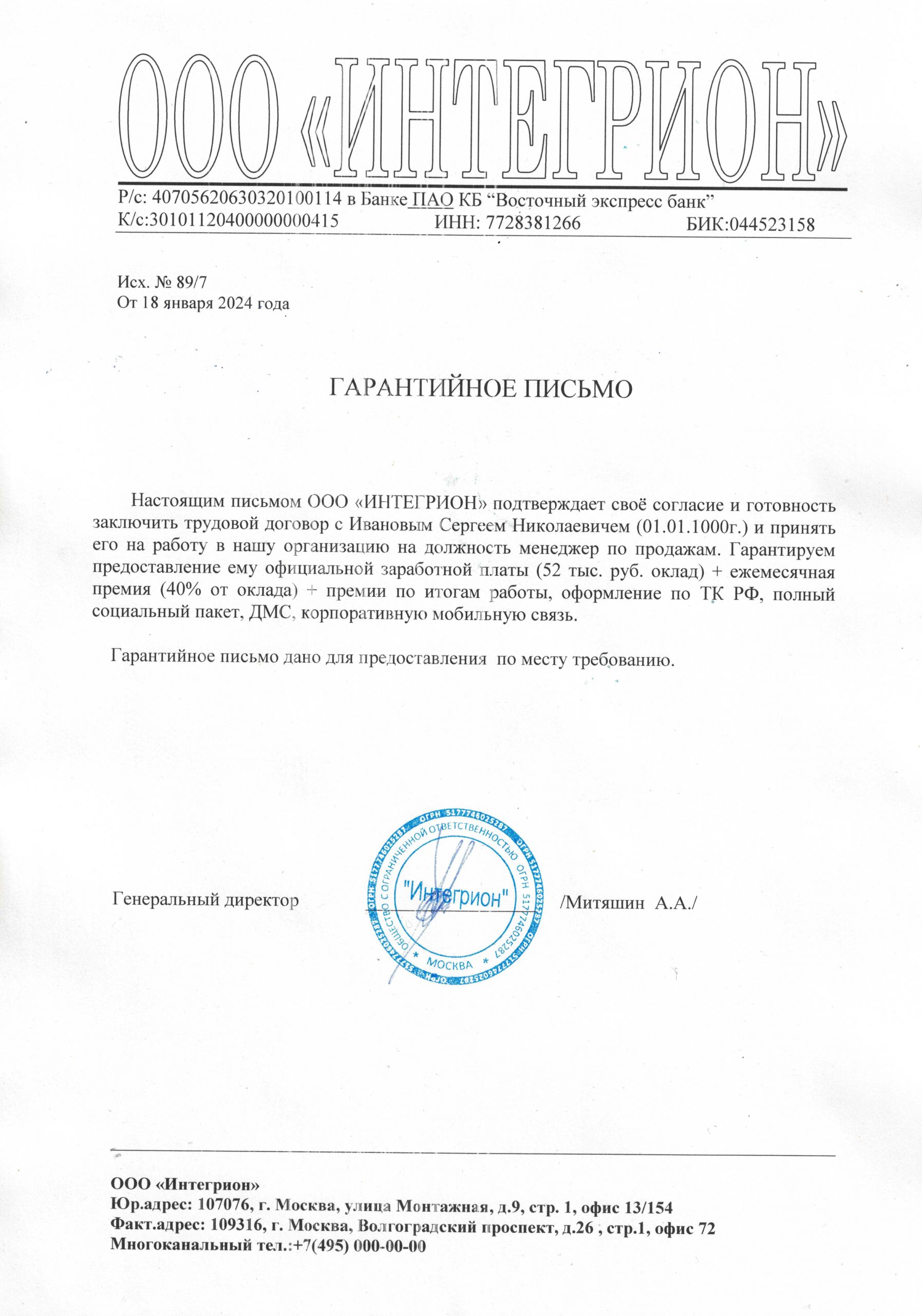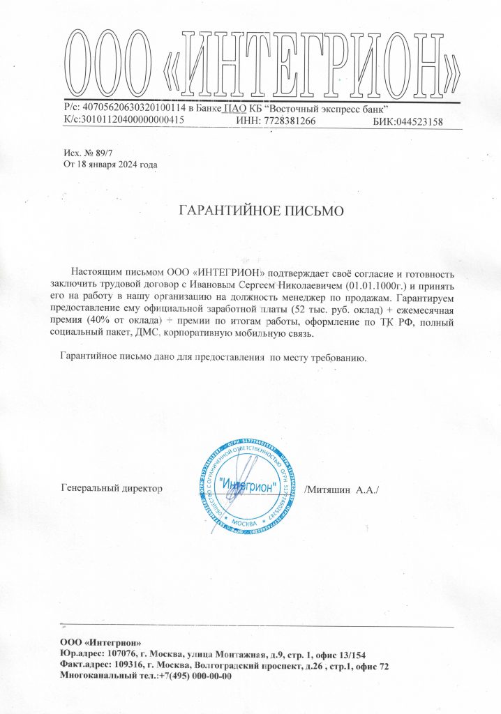 Справка и гарантийное письмо будут оформлены на официальном бланке предприятия, с обязательным указанием: